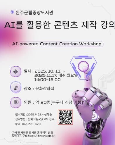 14일 완주군립중앙도서관은 내달 17일까지 매주 월요일 오후 2시부터 4시까지 ‘AI를 활용한 콘텐츠 제작’ 강연을 운영한다고 밝혔다.