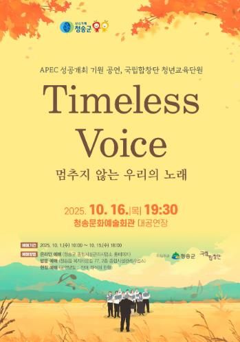 인사이드피플 강애자 기자 | 청송군은 오는 16일 저녁 7시 30분, 청송문화예술회관 대공연장에서 APEC 성공개최를 기원하는 국립합창단 청년교육단원 공연 ‘Timeless Voice – 멈추지 않는 우리의 노래’를 개최한다.