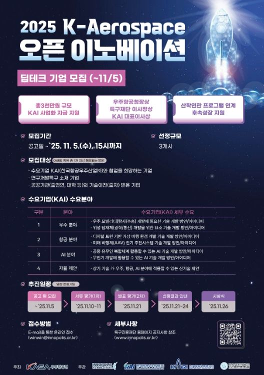 모집 대상은 수요기업인 KAI에서 제시한 4개 분야(우주·항공·AI, 자유)에서 KAI와 협업을 희망하는 기업으로, 서류 및 발표평가를 거쳐 최종 3개사를 선정할 예정이다.