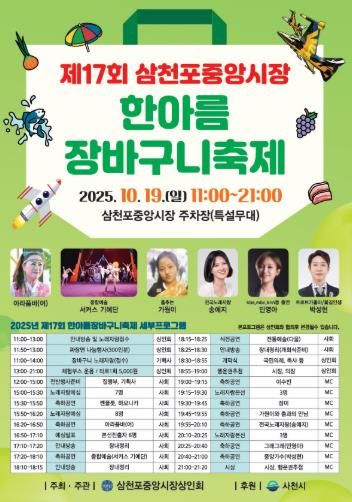 인사이드피플 노재현 기자 | 사천시는 10월 19일 삼천포중앙시장 공영주차장(특설무대)에서 ‘제17회 삼천포중앙시장 한아름 장바구니 축제’를 개최한다고 14일 밝혔다.