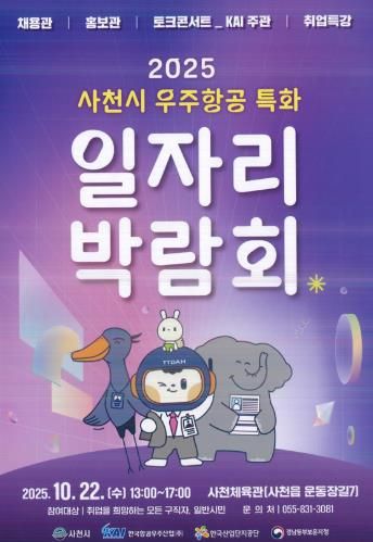 인사이드피플 노재현 기자 | 사천시는 오는 10월 22일 사천체육관에서 항공산업 중심의 청년 고용기회 확대를 위해 ‘2025년 사천시 우주항공특화 일자리박람회’를 개최한다.