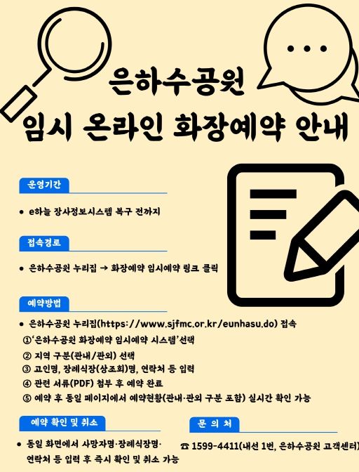 이용객은 은하수공원 누리집' 접속 후 ‘은하수공원 임시 화장예약 시스템’ 메뉴를 통해 고인명, 장례식장(상조회)명, 연락처 입력 및 관련 서류 첨부 절차를 거쳐 예약할 수 있다.