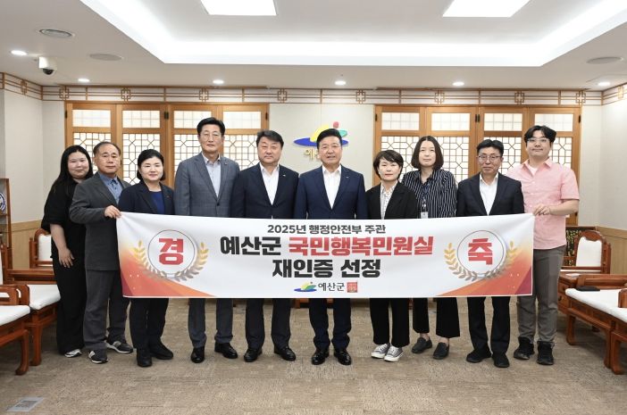 인사이드피플 노재현 기자 | 예산군은 행정안전부가 주관하는 ‘2025년 국민행복민원실’ 평가를 통과해 재인증 기관으로 선정됐다고 17일 밝혔다.