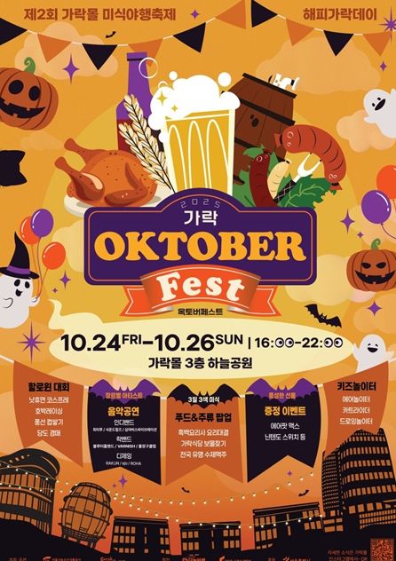 가을 분위기를 살린 할로윈 콘셉트 프로그램도 함께 열린다. 할로윈 코스프레, 호박레이싱, 풍선 컵 쌓기, 당도 경매 등 다채로운 경연이 진행되며, 우승자에게는 에어팟 맥스, 닌텐도 스위치, 플레이스테이션, 미식 상품권 등 푸짐한 경품이 제공된다. 또한 가락몰 영수증 이벤트, 맛잘알 스탬프, 사연 이벤트, 미식 이벤트 등 참여형 부대행사도 마련돼 상품권과 경품을 받을 수 있다.