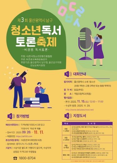 인사이드피플 노재현 기자 | 울산 남구는 청소년의 독서습관 형성과 건전한 토론문화 확산을 위해 오는 11월 15일 격동초등학교에서 개최하는‘2025년 제3회 울산광역시 남구 청소년 독서 토론축제’참가자를 모집한다고 밝혔다.