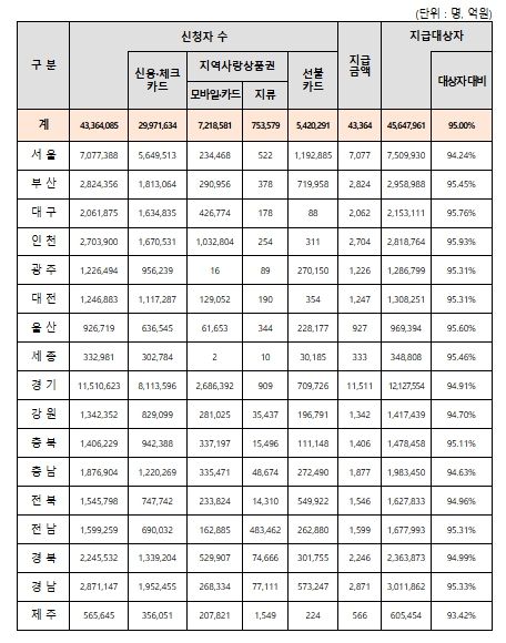 인사이드피플 심정보 기자 | 2차 민생회복 소비쿠폰 신청·지급 개시 이후 4주간(9.22(월)~10.19(일)) 지급대상자의 95.0%인 4천336만 명이 신청하고 4조 3천364억 원이 지급되어, 추석 연휴 간 오프라인 신청이 불가능했음에도 불구하고, 대다수 국민들이 소비쿠폰을 신청·지급받은 것으로 나타났다.(10.19. 24시 기준)