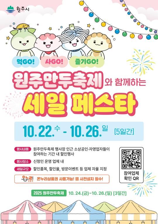 행사는 참여업체마다 개별적으로 진행되며, 할인 품목과 할인율 등 자세한 사항은 시 홈페이지, 원주만두축제 공식 SNS 등에 게시된 안내문의 큐알(QR)코드를 통해 확인할 수 있다.