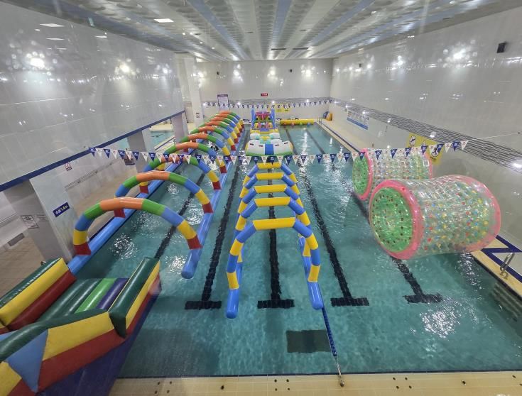 경기는 크게 두 종목으로 나뉜다. 먼저 ‘워터 레이스’는 수영장에 설치된 미끄럼틀, 분수 터널, 롤러 장애물 등 6개의 코스를 부모·자녀 팀이 통과하는 방식이다. 스피드와 협동심을 모두 요구하는 역동적 구성으로 참가자들이 숨 가쁘게 레이스를 펼칠 예정이다. 두 번째 종목인 ‘수중 철봉 오래 매달리기’는 수영장에 설치한 철봉에 매달려 버티는 체력 및 집중력 경기로, 수영장이라는 이색적인 환경이 경기의 재미를 더한다.