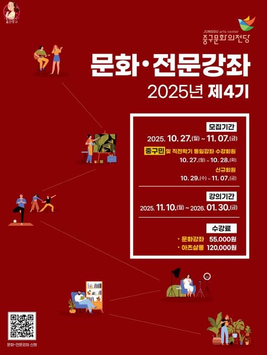 중구문화의전당은 오는 11월 10일부터 2026년 1월 30일까지 △음악 △미술 △문화 △무용 4개 분야의 일반강좌 76개와 전문 아카데미 강좌(아츠살롱) 6개 등 82개의 강좌를 운영할 계획이다.