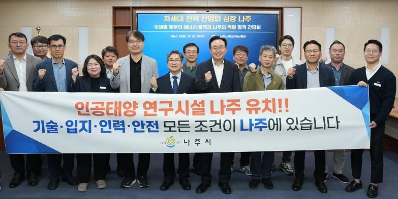 또한 간담회 참석자들은 ‘인공태양 연구시설 나주 유치’를 염원하는 퍼포먼스를 진행하며 정부 공모사업 대응 의지를 함께 다졌다.