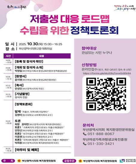 인사이드피플 김재윤 기자 | 부산광역시의회 복지환경위원회 윤태한 위원장(사상구1, 국민의힘)은 2025년 10월 30일 15시 부산광역시의회 2층, 대회의실에서 ⌜저출생 대응 로드맵 수립을 위한 정책토론회⌟를 개최한다고 전했다.
