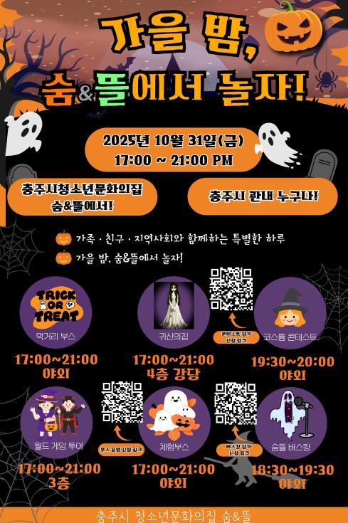 인사이드피플 강애자 기자 | 충주시청소년문화의집 숨·뜰에서는 10월 31일 오후 5시부터 9시까지 ‘가을밤, 숨뜰에서 놀자!’ 행사를 진행한다고 밝혔다.
