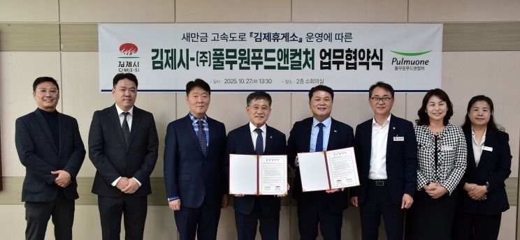 인사이드피플 심정보 기자 | 김제시는 27일 ㈜풀무원푸드앤컬처와 '새만금전주간' 고속도로 개통에 따라 새롭게 조성되는‘김제휴게소’운영에 따른 업무협약을 체결했다고 밝혔다.