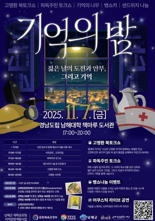 인사이드피플 강애자 기자 | ‘젊은 날의 도전과 안부, 그리고 기억’이라는 주제로 독일마을 기억의 밤 행사가 오는 11월 7일 17시부터 경남도립남해대학 책마루도서관에서 열린다.