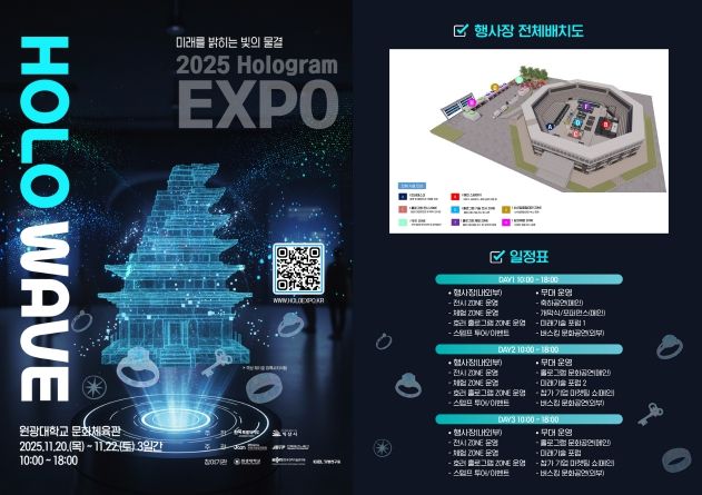 인사이드피플 노재현 기자 | (재)전북특별자치도 콘텐츠융합진흥원(원장 김성규)은 ‘2025 홀로그램 엑스포 HOLO WAVE’가 오는 11월 20일부터 22일까지 3일간, 오전 10시부터 오후 6시까지 익산 원광대학교 문화체육관에서 개최된다고 밝혔다.