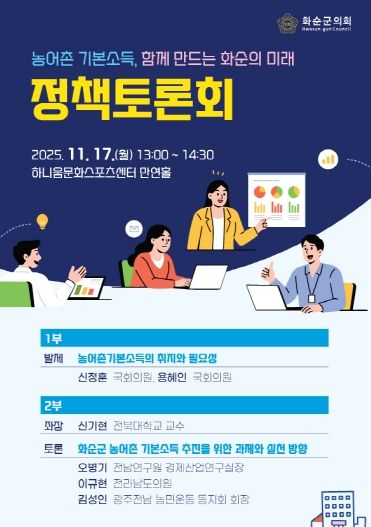 인사이드피플 김재윤 기자 | 화순군의회는 오는 11월 17일 오후 1시, 하니움문화스포츠센터 만연홀에서 ‘농어촌 기본소득, 함께 만드는 화순의 미래’를 주제로 농어촌 기본소득 정책토론회를 개최한다.