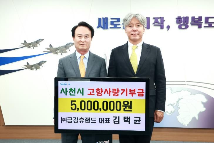 인사이드피플 노재현 기자 | 사천시는 조경 시설물 제조·설치업체인 (주)금강휴랜드의 김택균 대표가 고향사랑기부금 500만 원을 기부하며, 사천 지역사회 발전에 뜻깊은 나눔을 실천했다고 28일 밝혔다.