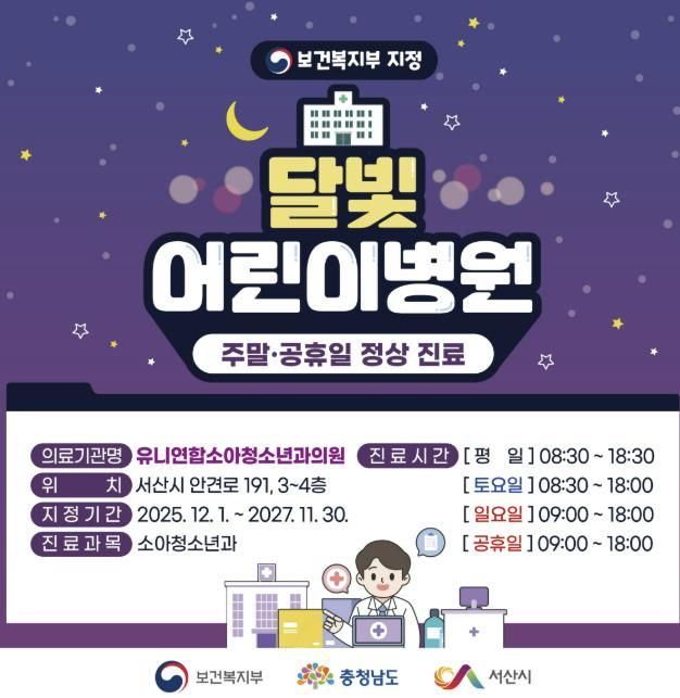 인사이드피플 노재현 기자 | 충남 서산시는 동문동에 있는 유니연합소아청소년과의원이 관내 1호 달빛어린이병원으로 지정됐다고 밝혔다.