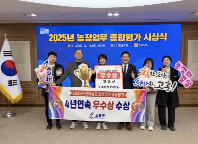 인사이드피플 노재현 기자 | 고흥군이 전라남도가 주관한 ‘2025년 농정업무 종합평가’에서 4년 연속 ‘우수상’을 수상하며, 농업 강군(强郡)으로서의 위상을 다시 한번 입증했다.