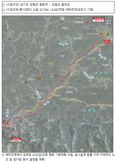 이 사업은 경기도 양평 용문역(경의중앙선)에서 강원도 홍천을 연결하는 광역철도 건설사업으로 기존 경의중앙선에서 분기하여 총 연장 32.7km를 신설하는 사업이다.