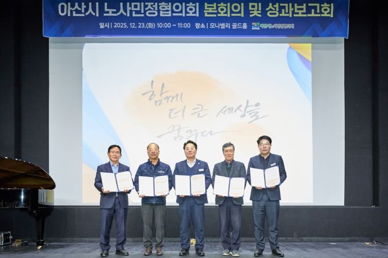 인사이드피플 노재현 기자 | 아산시 노사민정협의회(위원장 오세현 시장)는 23일 모나밸리에서 협의회 위원과 기업 관계자 등 100여 명이 참석한 가운데 ‘2025 아산시 노사민정협의회 성과보고회’를 열고, 올해 협력사업 성과를 공유했다.
