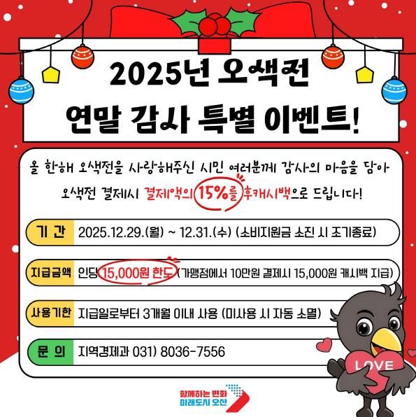 인사이드피플 노재현 기자 | 오산시는 한 해 동안 지역화폐를 이용해 준 시민들에게 감사의 뜻을 전하고, 연말 소비 활성화를 도모하기 위해 ‘2025년 오색전 연말 감사 특별 이벤트’를 추진한다.