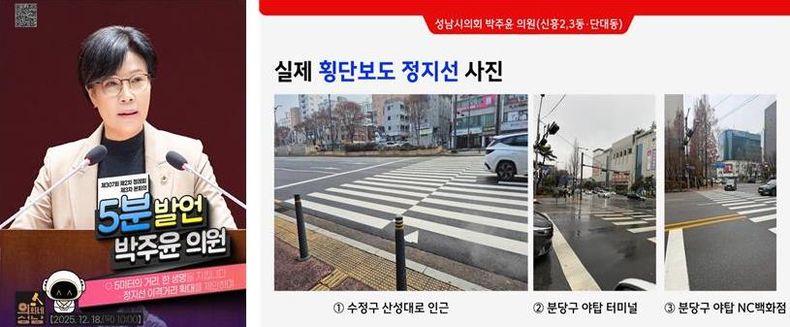 박 의원은 이날 수정구 산성대로와 분당구 야탑동 횡단보도 현장 사진을 직접 공개하며, “정지선을 지켜도 보행자와의 안전 거리가 전혀 확보되지 않는 실정”이라고 강조했다. 그는 “이곳을 매일 아이들과 어르신, 시민들이 건너고 있다”며, “지금 이 거리 그대로 괜찮은지 우리 모두가 답해야 할 문제”라고 말했다.