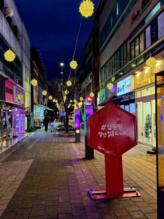 인사이드피플 강애자 기자 | 양산시는 지난 23일 경상남도 제1호 소상공인 특화거리인 양산젊음의거리 경관조명 설치사업이 마무리됐다고 밝혔다.