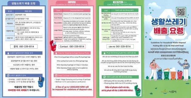 인사이드피플 노재현 기자 | 외국인 거주자와 근로자가 생활폐기물 배출 방법을 쉽게 이해하고 올바르게 실천할 수 있도록 나주시가 다국어 홍보물을 제작해 무단투기 예방과 쾌적한 도시환경 조성에 나선다.