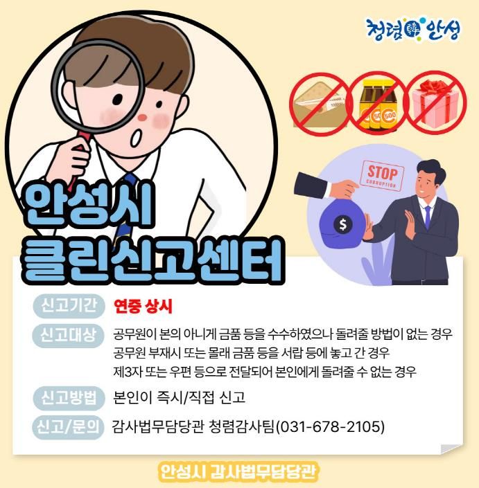 인사이드피플 노재현 기자 | 안성시는 시민들에게 신뢰받는 공정하고 투명한 행정 서비스를 제공하기 위해 ‘클린신고센터’를 연중 상시운영하며 청렴한 행정문화 정착에 힘쓰고 있다고 밝혔다.