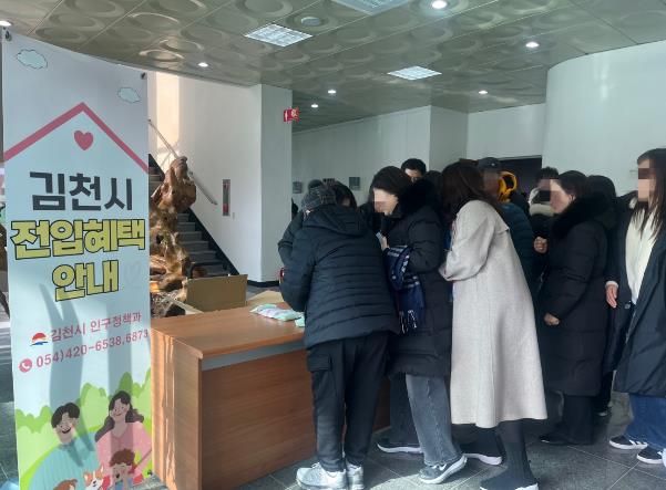 이날 김천시 인구정책과 직원들은 ▲전입지원금 ▲기숙사비 지원금 ▲교복 지원금 등 학부모들의 교육·생활비 부담을 덜어주는 전입 관련 혜택을 중점적으로 설명하고 전입을 독려했다.