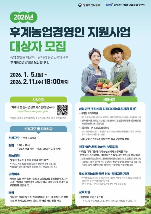 후계농업경영인 육성사업은 선정된 농업인에게 최대 5억원의 융자 지원을 제공하고, 선정된 후계농의 영농 경영 및 역량강화를 위한 교육프로그램도 지원한다.