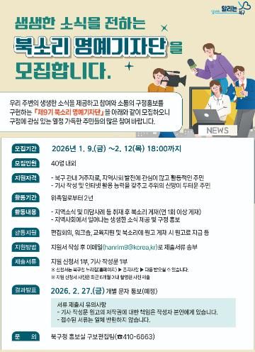 문인 북구청장은 “북소리 명예기자단은 주민이 직접 지역의 변화와 일상을 전하는 메신저인 만큼 이번 모집에 많은 관심과 참여를 바란다”며 “앞으로도 북소리가 주민과 행정의 소통 창구 역할을 할 수 있도록 다양한 지원을 아끼지 않겠다”고 말했다.