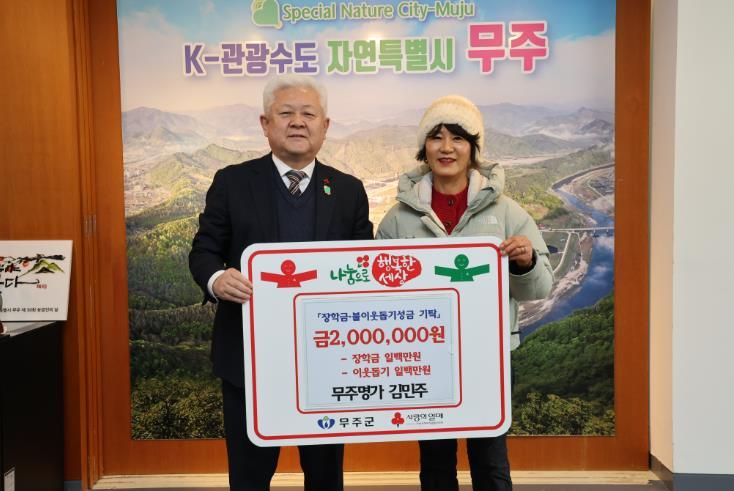 인사이드피플 노재현 기자 | 무주군 무주읍에 위치한 한식 전문점 ‘무주명가’의 김민주 사장이 지난 14일 무주군에 이웃돕기 성금 1백만 원, (재)무주군교육발전장학재단에 장학금 1백만 원 등 총 2백만 원을 기탁했다.
