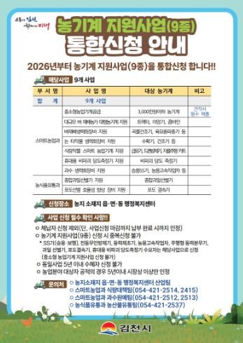 인사이드피플 노재현 기자 | 김천시는 지역 농업인을 대상으로 ‘2026년 농기계 지원사업(9종)’ 신청을 오는 2026년 1월 30일(금)까지 농지소재지 읍면동 행정복지센터에서 접수한다고 밝혔다.