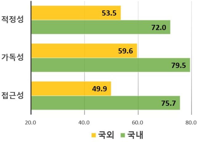 반면 해외사업자의 경우 표준화된 ‘개인정보 처리방침’ 명칭이 아닌 다른 명칭을 사용하거나 정보주체 권리행사 안내를 영문으로만 제공하는 경우도 있어 특히 국내기업 대비 가독성, 접근성 분야에서 낮은 평가를 받았다.