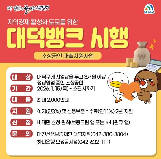 인사이드피플 심정보 기자 | 대전 대덕구는 경기침체로 자금 운용에 어려움을 겪는 지역 소상공인의 금융 부담을 완화하기 위해 소상공인 대출지원사업 ‘2026 대덕뱅크’를 시행한다.