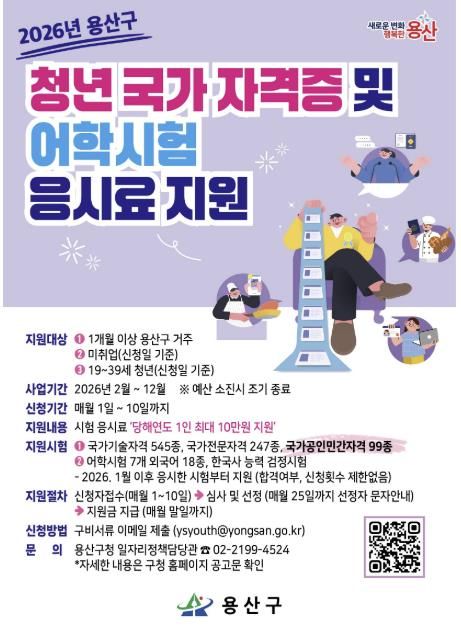 박희영 용산구청장은 “지난해 예산 조기 소진은 청년들의 수요가 매우 높다는 것을 보여준 결과”라며 “올해는 사업 규모를 대폭 넓힌 만큼 더 많은 청년들이 실질적인 도움을 받아 자기계발을 이룰 수 있기를 기대한다”고 전했다.