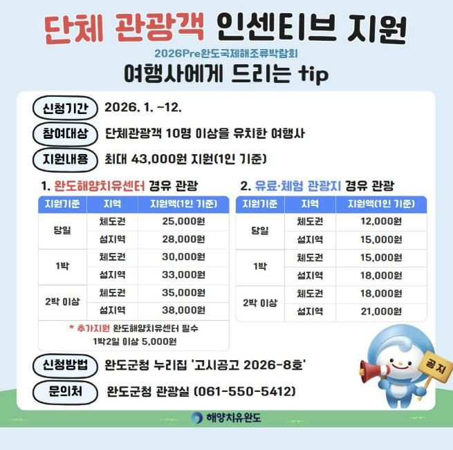 군 관계자는 “완도는 해양과 산림 치유, 섬 테마 치유가 어우러진 국내에서 유일한 치유의 섬으로 많은 관광객이 오래 머무르며 힐링할 수 있도록 인센티브 지원 사업을 확대한다”면서 “단체 관광객 유치로 관광과 경제 활성화에 보탬이 될 수 있도록 하겠다”라고 말했다.