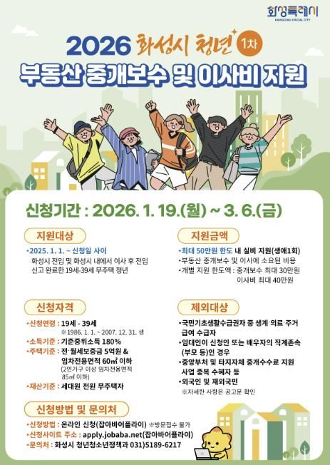 인사이드피플 노재현 기자 | 화성특례시가 19일부터 3월 6일까지 청년들의 주거비 부담 경감 및 정주 여건 향상을 위한 ‘2026년 상반기 청년 부동산 중개보수 및 이사비 지원사업’ 신청을 받는다.