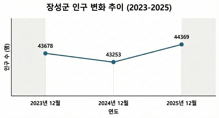 인사이드피플 노재현 기자 | 장성군이 지방 소멸과 인구 감소 우려를 해소하는 유의미한 통계를 발표했다. 군에 따르면 지난해 12월 집계된 장성군의 인구는 4만 4369명으로, 1년 전보다 1116명 증가한 것으로 나타났다.
