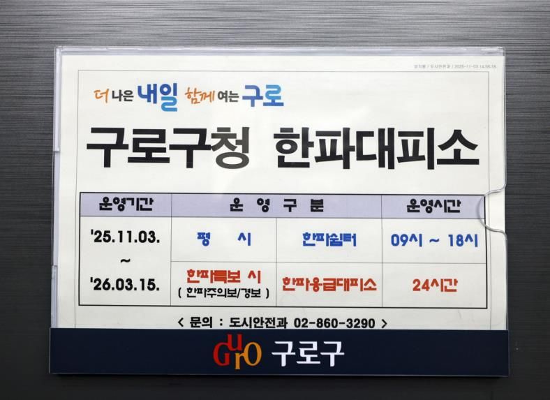 구로구 관계자는 “강추위에 선제적으로 대비하고 있으며, 한파특보 발효 시 주민 불편과 피해가 없도록 신속히 대응하겠다”며 “주민들께서는 가까운 쉼터를 적극 활용해주시길 바란다”고 말했다.