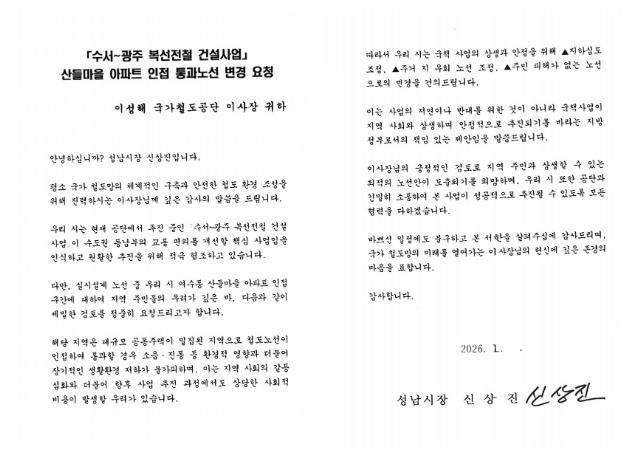 인사이드피플 노재현 기자 | 성남시는 지난 16일 김윤덕 국토교통부 장관과 이성해 국가철도공단 이사장에게 ‘수서~광주 복선전철(이하 수광선) 건설사업’과 관련하여 여수동 산들마을 아파트 인접 통과 구간의 노선 변경을 요청하는 서한을 전달했다고 20일 밝혔다.