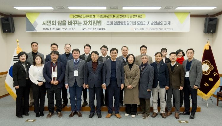 인사이드피플 김재윤 기자 | 강릉시의회와 국립강릉원주대학교가 시민 중심의 자치입법 실현을 위해 힘을 모았다. 양 기관은 지난 21일 지방 입법정책 발전과 지역공익 법률 지원을 위한 업무협약(MOU)을 체결한 데 이어, 23일 오후 3시 강릉시의회 대회의실에서 '시민의 삶을 바꾸는 자치입법' 정책포럼을 공동 개최했다.