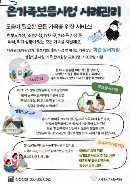 센터는 “가족의 위기는 약함이 아니라, 도움이 필요한 순간일 뿐”이라며 “사천시가족센터가 언제나 가족의 곁에서 함께 하겠다”고 전했다.