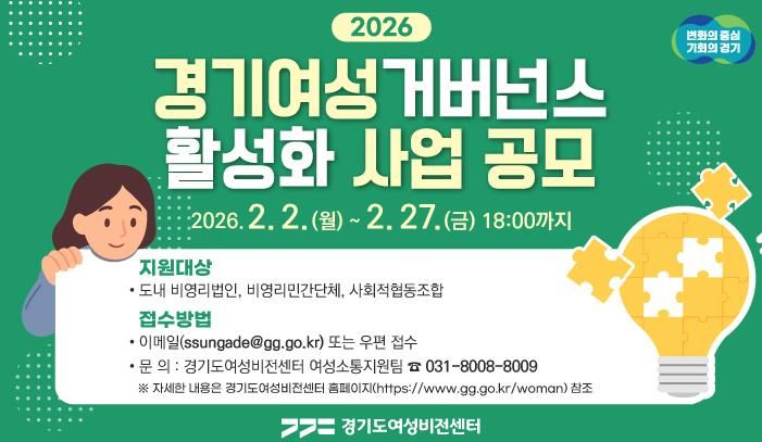 인사이드피플 노재현 기자 | 경기도여성비전센터가 오는 2월 27일까지 경기여성거버넌스 활성화 공모사업 수행 단체를 모집한다.