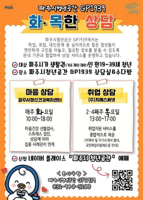 인사이드피플 노재현 기자 | 파주시는 청년들의 심리 안정과 취업 역량 강화를 위해 파주시청년공간 지피(GP)1939에서 진행하는 상담 프로그램 ‘화·목한 상담’의 참여자를 모집한다.