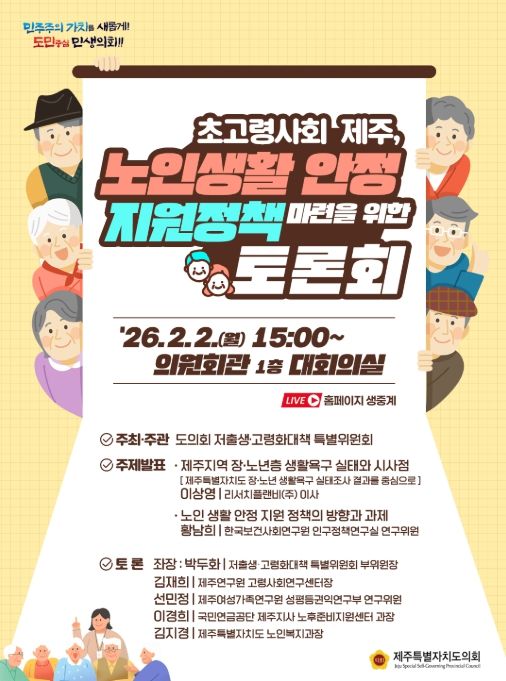 인사이드피플 김재윤 기자 | 2일 제주도의회 대회의실에서 제주특별자치도의회 저출생‧고령화대책 특별위원회 주최‧주관으로 ‘노인 생활 안정 지원 정책 방향’ 정책토론회가 열린다.