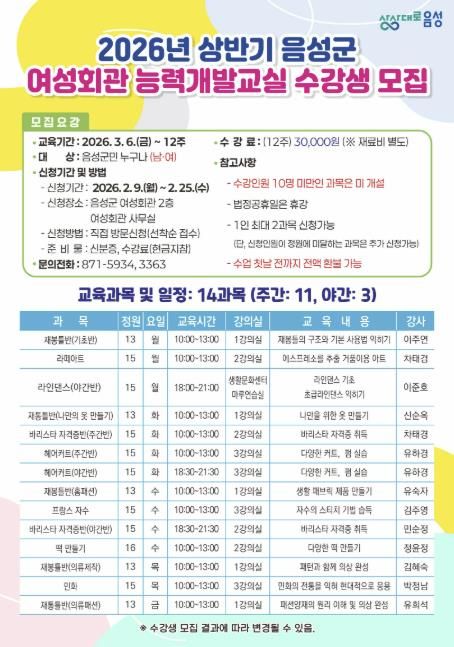 인사이드피플 노재현 기자 | 음성군은 2026년 상반기 여성회관 능력개발교실 수강생을 모집한다.