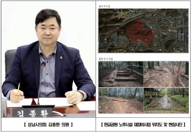 인사이드피플 김재윤 기자 | 성남시의회 국민의힘 김종환 의원(판교·백현·운중·대장동, 예산결산특별위원장)은 분당구 판교동 판교공원 일원 노후 산책로와 바닥포장 등을 정비하는 재정비공사가 본격 추진됨을 밝혔다.